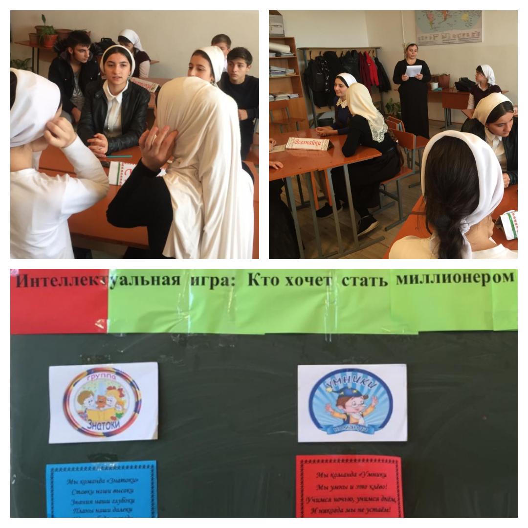 23.11.2019Заместитель директора по воспитательной работе Абдулкадырова З.Ш. с организатором школы Оздамировой А. С. проведена познавательная игра «Кто хочет стать миллионером». Учащиеся были разделены на 3 команды: Умники, Всезнайки, Знатоки. Учащиеся активно участвовали в игре. 1-ое место заняла команда «Всезнайки». Учащимся очень понравилось.Им были вручены грамоты.