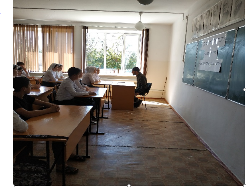25.09.2020В 9 кл. педагог-организатор по ДНВиР Шамсудов М.А. провел беседу на тему «Скажи наркотикам нет!». Цель - донести молодежи правду о наркотиках, чтобы информировать как можно больше молодых людей и укрепить их в решении не принимать наркотики. Мовсар Адамович с обучающимися обсудили, какой вред наносит здоровью употребление наркотических веществ, почему подростки склонны к вредным привычкам, какая ответственность предусмотрена в РФ за распространение и хранение наркотических веществ. В конце беседы они пришли ко мнению, что наркомания – это тяжелая неизлечимая болезнь, разрушающая мозг, психику, физическое здоровье человека (особенно подростка) и оканчивающаяся преждевременной смертью. Ребята выбирают здоровый образ жизни, говорят Наркомании – «НЕТ!».