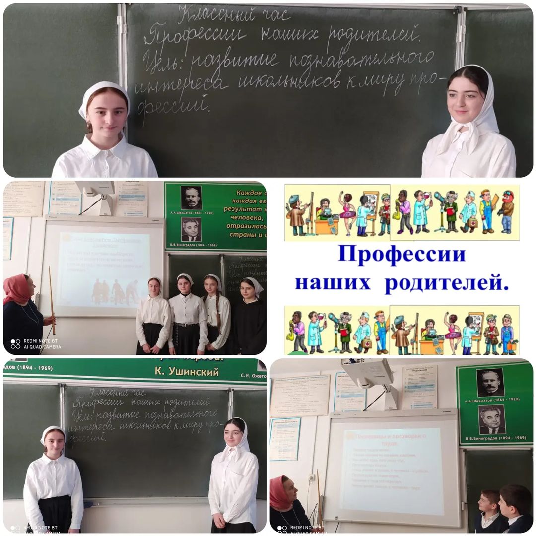Классный руководитель 7А класса Ульбиева З.Н. провела классный час на тему "Профессии наших родителей". Цель: познакомить с профессиями родителей, расширить знания о многообразии профессий.