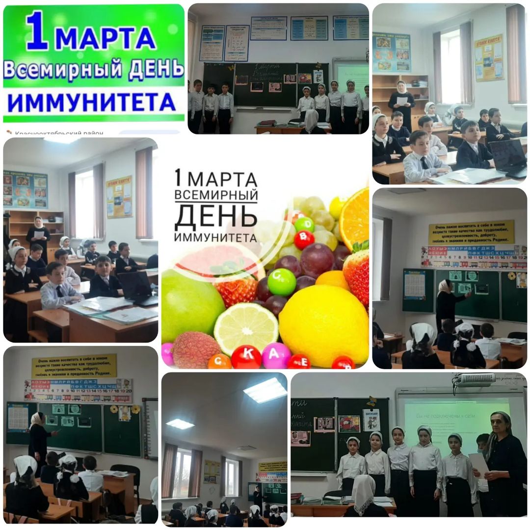 01.03.2022Классные руководители 4 -х классов Яшуркаева К.Х. и Накостова Х.М. провели классные часы "1 марта Всемирный день иммунитета". Цель этого классного часа - информировать детей о значении и особенностях иммунной системы и способах её укрепления. Всемирный день иммунитета - это возможность подчеркнуть важность и значимость здорового образа жизни, сохранения главного ресурса человечества - здоровья. Камета Магомедовна отметила, что иммунитет - это уникальная способность организма самостоятельно защищаться от болезнетворных бактерий и вирусов.