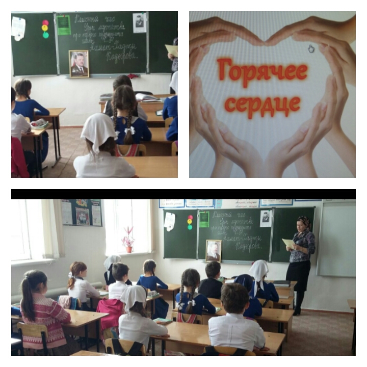 Классные руководители 4 класса рассказали ребятам о герое Первого Президента Главы ЧР Ахмат-Хаджи Кадырове,о героях Ставропольского края, которые стали лауреатами инициативы «Горячее сердце». В классах были проведены классные часы на тему: «Легко ли быть героем?», «Герои нашего времени. Кто они?