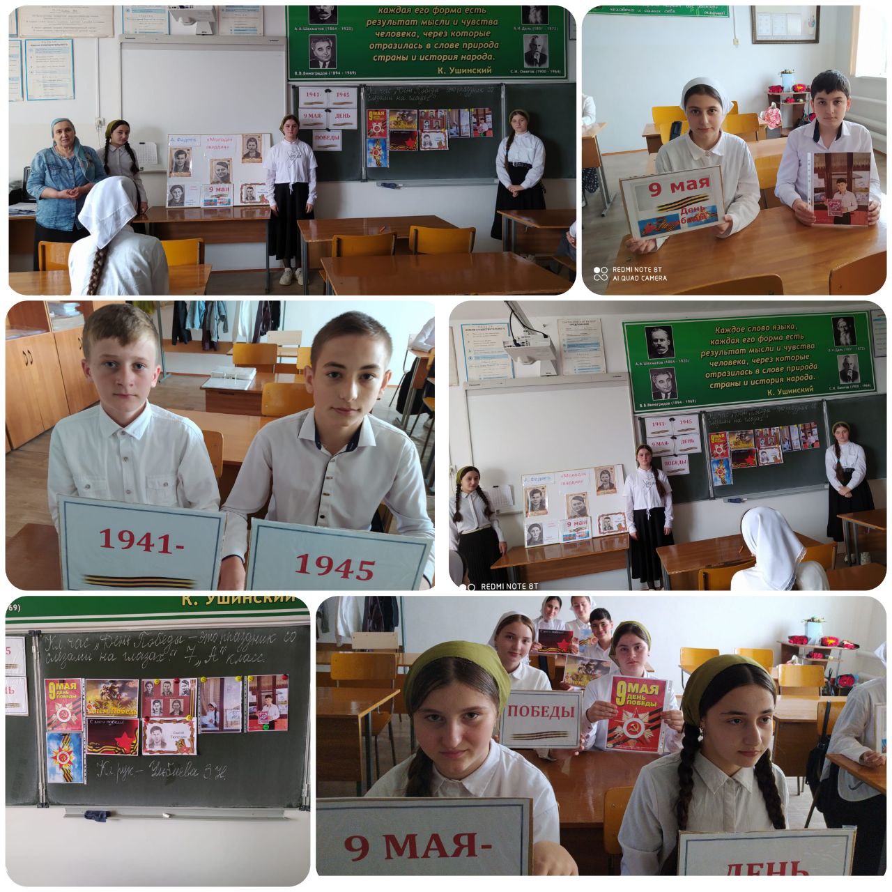 05.05.2022Ульбиева З.Н. классный руководитель 7а класса провела классный час "День Победы - это праздник со слезами на глазах". В целях расширить знания детей о Великой Отечественной войне, о знаменательной дате - годовщине Великой Победы и её значении в истории человечества; способствовать воспитанию патриотических чувств, любви и гордости за свою страну, уважительного отношения к ветеранам войны; познакомить с песнями, написанными в годы войны. В завершении классного часа Зинаида Нохаевга отметила, что мы победили в этой страшной войне.