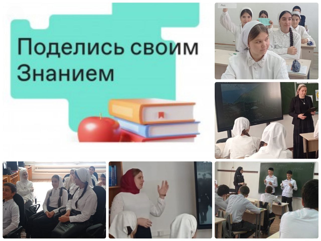 12.09.2022Во исполнение письма Министерства образования и науки Чеченской Республики №133/07-06 от 12.09.2022г. в целях передачи молодежи достоверных знаний как одной из главных ценностей современного общества , с 1 по 9 сентября проходит Всероссийская просветительская акция «Поделись своим Знанием», организованная Российским обществом «Знание» при поддержке Министерства просвещения РФ и Министерства науки и высшего образования РФ. 9 сентября 2022 года МБОУ «СОШ с.п. Подгорное» в рамках акции «Поделись своим Знанием» провела беседу «Моя профессия» с обучающимися 9-х классов бывшая ученица МБОУ «СОШ с.п. Подгорное» Заведующая ДК с.п. Подгорное Даудова М.Э. Максалина Эдиковна поделилась опытом своей работы в форме диалога, общалась на равных с ребятами, отвечала на их вопросы, делясь своим уникальным знанием, рассказывала о современных возможностях. Участие в акции – это прекрасная возможность познать себя, а также вдохновиться на новые свершения.