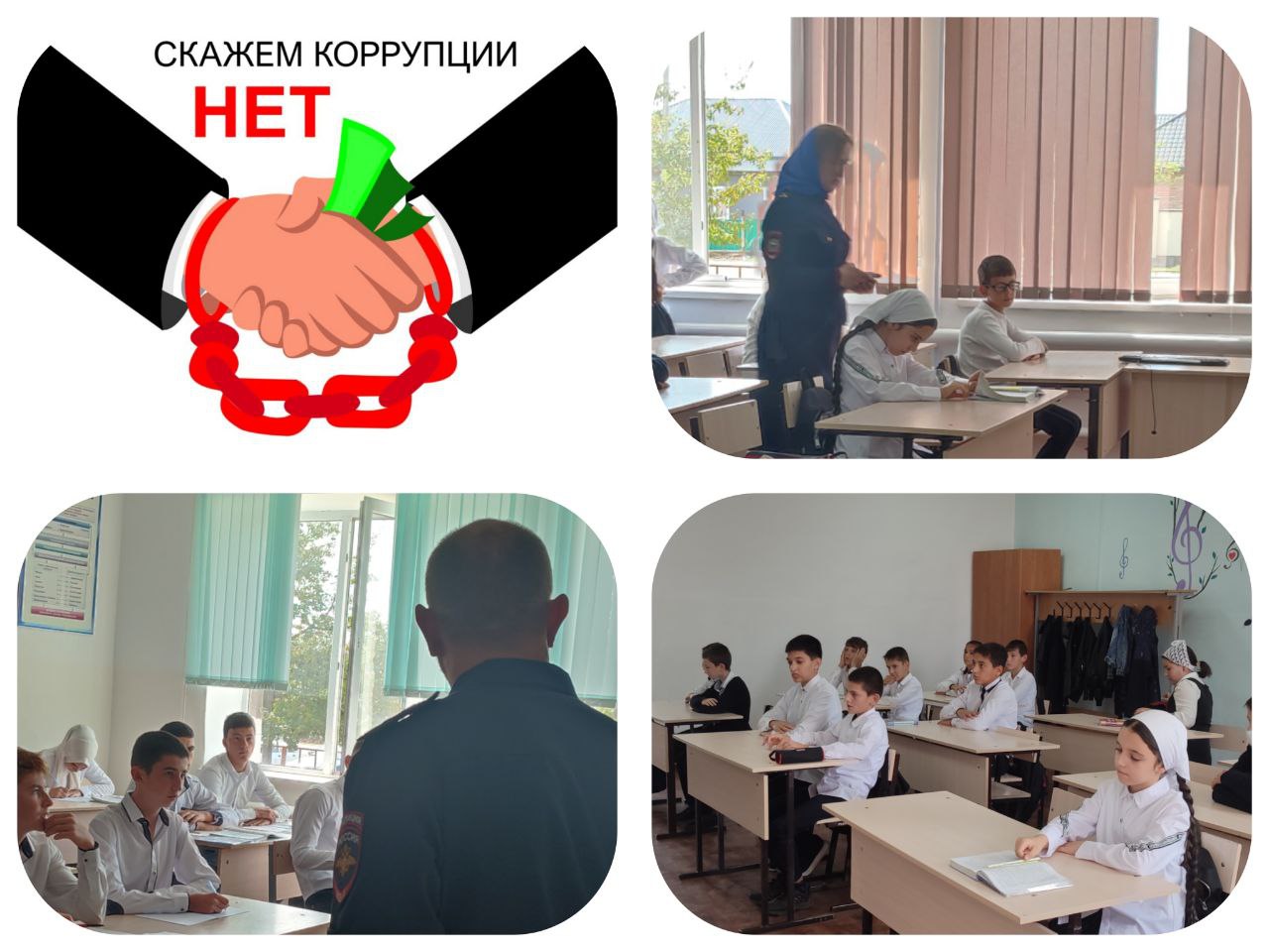 Инспекторами ОПДН ОМВД РОССИИ по Надтеречному району по ЧР мл. Лейтенантом Идрисовым М.С. и лейтенантом полиции Сельмурзанвой Х.А. проведена беседа в 7-9 классах по противодействию коррупции.