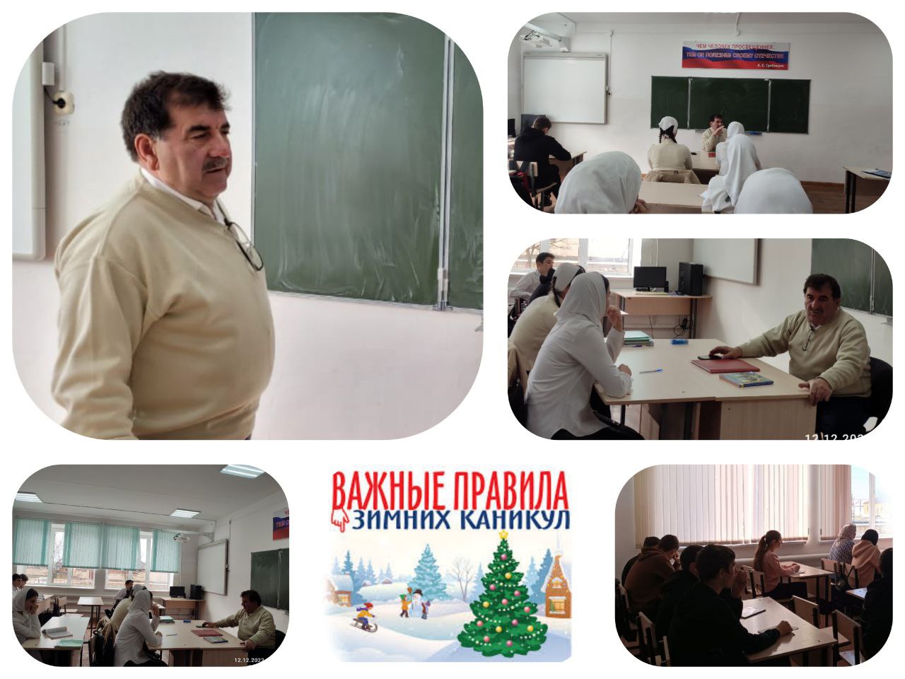 23.12.2022С 19 по 21 декабря учитель ОБЖ Сатуев Х.А. провел беседы среди обучающихся 5-9 классов на тему «Правила поведения во время зимних каникул». Цель: Формировать у детей культуры безопасного поведения в период зимних каникул.