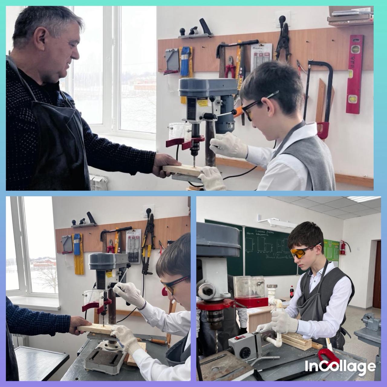 Урок технологии у мальчиков. Работа на станках и резка пилой.